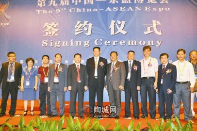 在第九届中国—东盟博览会签约仪式上,贵港市政府副市长肖明贵(左六),桂平市委书记杨评防(左五),桂平市委副书记、长安工业集中区管委会主任陆兵(右五),桂平市政府副市长薛有彪(左四)等领导与广州快菱电梯有限责任公司董事长梁焕基(右四)等签约企业领导合影 (资料图片)记者 霍敏仪
