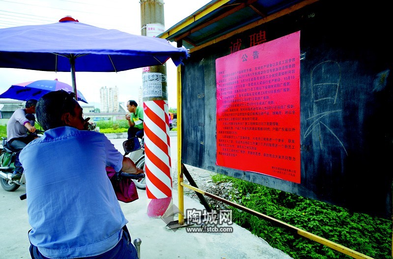 7月1日,肇庆鼎湖区永安镇贝水工业园,国美陶瓷的几个员工在工厂门口看张贴的放假公告,为拿到拖欠的工资,他们一边开摩的谋生,一边等待工厂开工。记者 肖海波