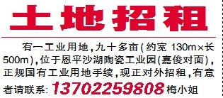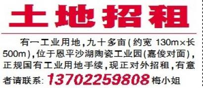有一工业用地,九十多亩(约宽130m×长500m),位于恩平沙湖陶瓷工业园(嘉俊对面),正规国有工业用地手续,现正对外招租,有意者请联系:13702259808梅小姐