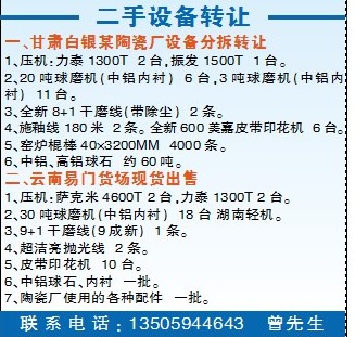 1、压机:萨克米4600T2台,力泰1300T2台。2、30吨球磨机(中铝内衬)18台湖南轻机。3、9+1干磨线(9成新)1条。4、超洁亮抛光线 2条。5、皮带印花机 10台。6、中铝球石、内衬 一批。7、陶瓷厂使用的各种配件 一批。