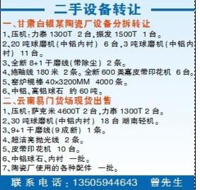 1、压机:力泰1300T2台,振发1500T1台。2、20吨球磨机(中铝内衬)6台,3吨球磨机(中铝内衬)11台。3、全新8+1干磨线(带除尘)2条。4、施釉线180米 2条。全新600美嘉皮带印花机 6台。5、窑炉棍棒40×3200MM 4000条。6、中铝、高铝球石 约60吨。