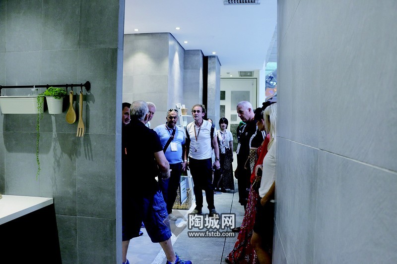 国外客商在费罗娜水泥砖展厅内交流产品心得