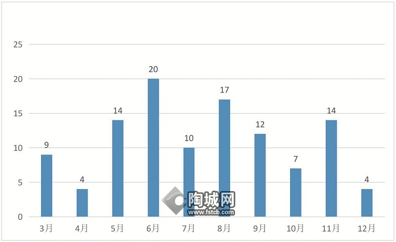 从统计情况来看,终端活动贯穿全年,从开年的3月份到年末的12月份,月月有活动,平均每月达11家/次。从单月情况来看,除了因为中国传统的“清明前后不装修”说法,4月陶瓷企业在终端的活动明显减少,12月临近年底,各陶企在忙着做年终总结,终端活动也接近尾声外,其他月份活动都在高频次运行。而所谓的6-8月份淡季,更是终端活动的井喷期,以活动带动销售的趋势相当明显。6月份终端活动更是高达20家/次,其次是8月份,17家/次。
