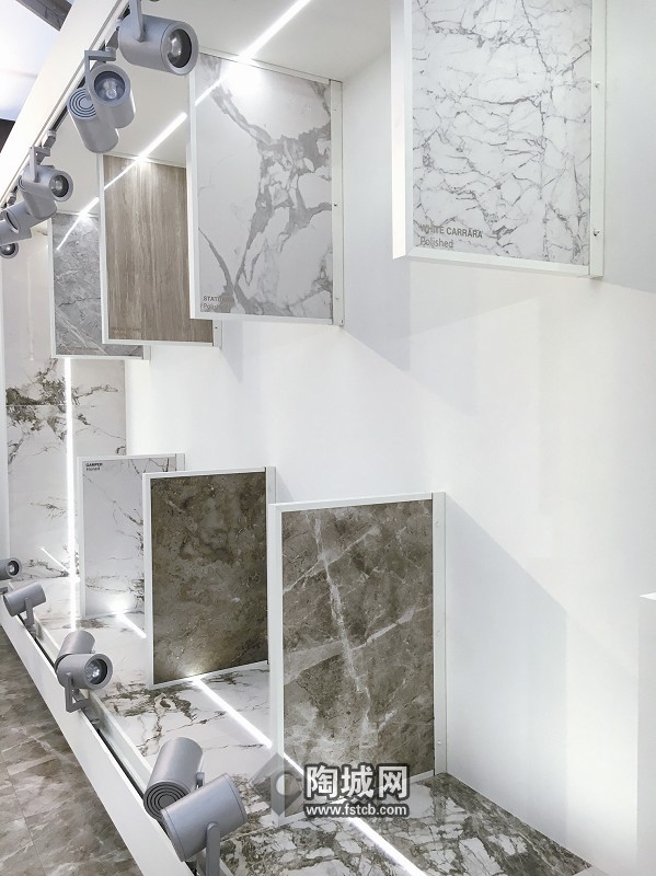 传统的铺贴方案都是墙地面只用同一款大理石瓷砖,企业在展位展示时也多以单一产品呈现。不过在今年的博洛尼亚展上,不少企业都采用大理石瓷砖混搭铺贴的方案来展示产品效果。
