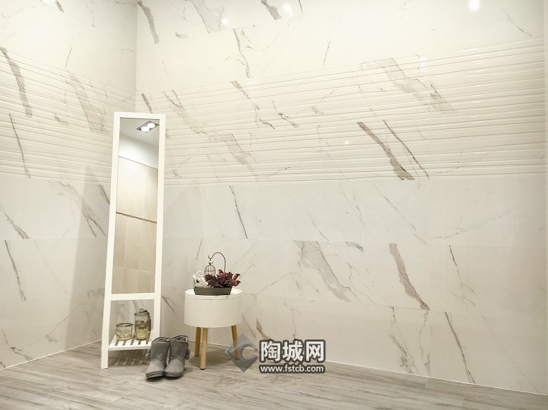 大规格瓷砖整砖应用适用于高端综合场所,比如高级酒店、政企工程、豪华会所、高档写字楼、别墅、私人府邸等,施工得当,几乎看不见拼贴痕迹,整体纹理效果更统一。其次,大规格大理石瓷砖可以灵活切割,进行不同规格的混铺,铺贴自由度更高。