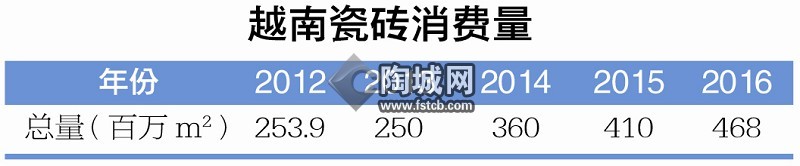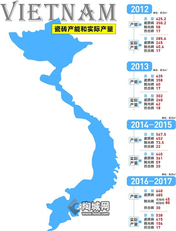 据越南建筑陶瓷协会表示,目前越南国内瓷砖消 费需求在5亿m2左右,较往年增长了25%。此外,瓷砖年产能也达到了6.5亿m2,增长了30%。“在瓷砖消费低迷了一段时间以后,瓷砖生产商通过提高产能来快速应对瓷砖消费的恢复趋势,是一件好事情。比如,Vitto就在2016年把产量从2015年的1200万m2提升至了2400万m2。”Viglacera 公司负责人还表示,就Viglacera 公司本身来说,其 2016年的产能也从 2015年的1850万m2增长到了2050万m2,而Thach Ban(石盘集团)2016年的产能也从2015年的900万m2增长到了2016年的1600万m2。