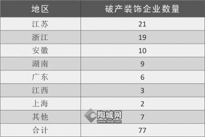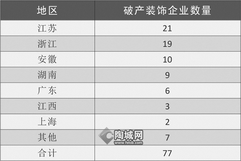据陶城报记者不完全统计,2023年,全国共有77家装饰公司宣布破产。这其中,江苏、浙江、安徽破产装饰企业数量最多,分别为21家、19家、10家。大部分装饰企业破产的原因在于资不抵债。