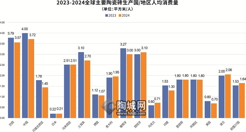 根据2025世界瓷砖论坛数据,2024年中国人均陶瓷砖消费量为3.72m2,处于下滑状态。而17个主要生产国/地区人均陶瓷砖消费量的平均值和中位数分别是1.96m2和1.8m2。考虑到中国是人均陶瓷砖消费量最高的国家,而且装修材料首选瓷砖的情况不会轻易改变,未来中国的人均陶瓷砖消费量或许会下降至2.5m2左右。